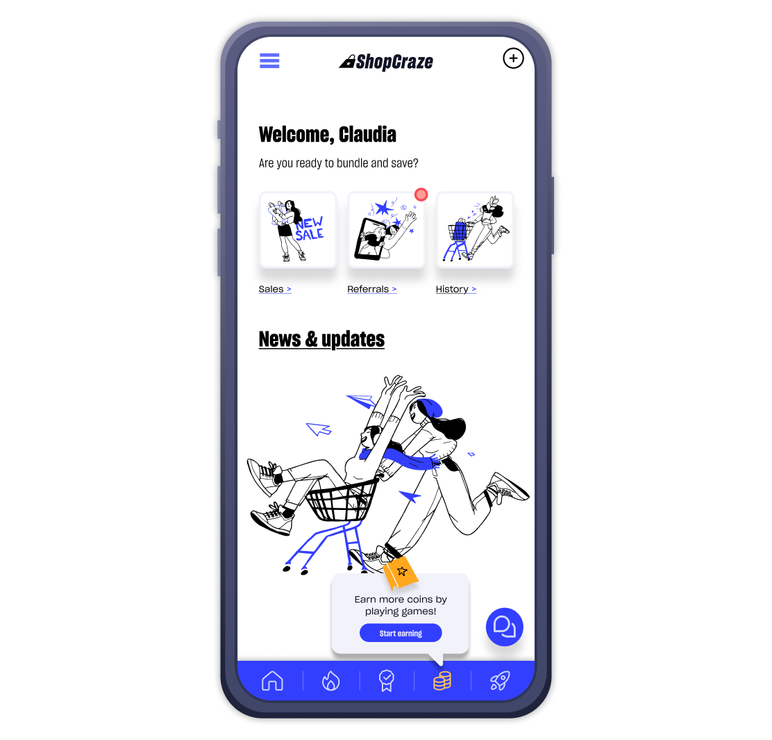 厳選されたモバイルゲームを、アプリ体験に直接組み込みます。ユーザーは任意でゲームをプレイし、ゲーム内のタスクを達成することで、アプリ内通貨を獲得できます。