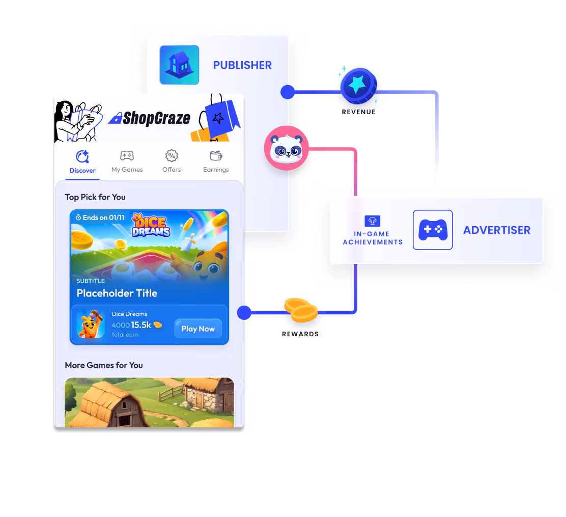 アプリ内に厳選されたゲームを直接組み込むことで、ユーザーは報酬としてアプリ内通貨を獲得でき、パブリッシャーはゲームのインストールごとに収益を得ることができます。