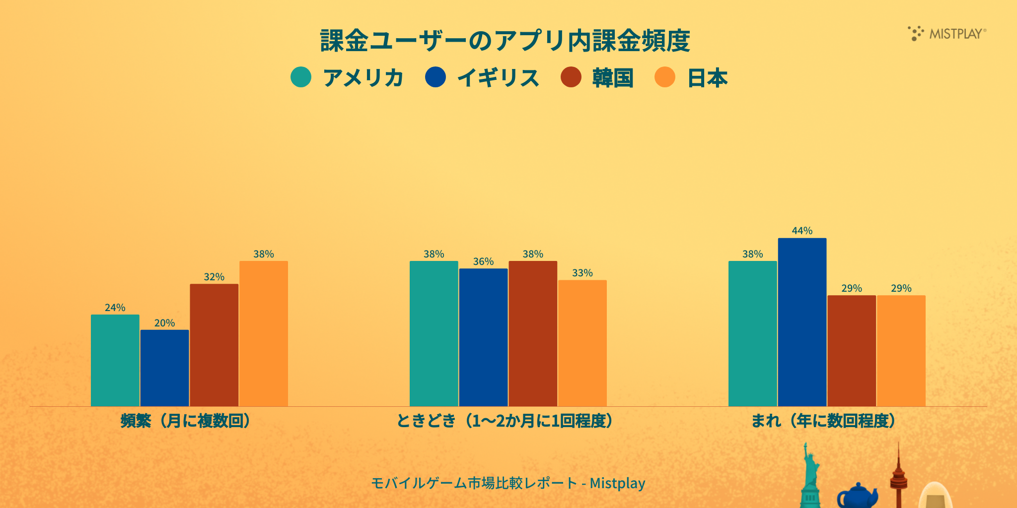 欧米では、大半のプレイヤー(アメリカ:63%、イギリス:62%)が週に4本以上のモバイルゲームを遊んでしており、より幅広くさまざまなゲームを試したいという“探索型”の傾向が見られます。
