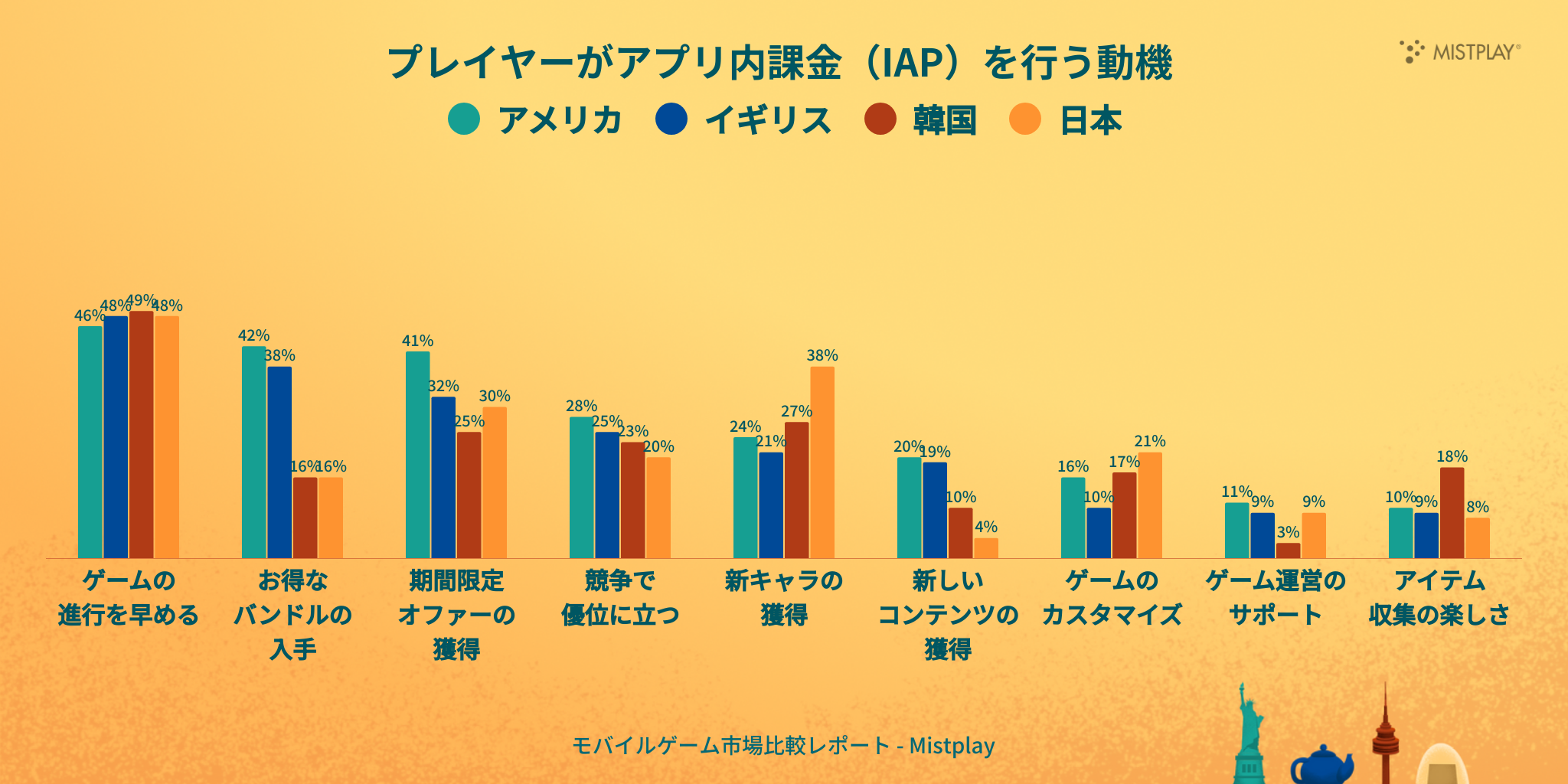 ゲームの進行を早めたいという思いは世界共通で課金の動機となる一方で(48%)、課金の内容は国ごとに異なります。これは、日本も例外ではありません。欧米のプレイヤーは「お得感」を重視し、割安感のあるバンドルや期間限定オファーに反応します。一方で日本や韓国のプレイヤーは、新キャラクターの獲得、コレクション性のあるガチャ、ブランディングされたIPを使ったコンテンツといった特別感に惹かれます。